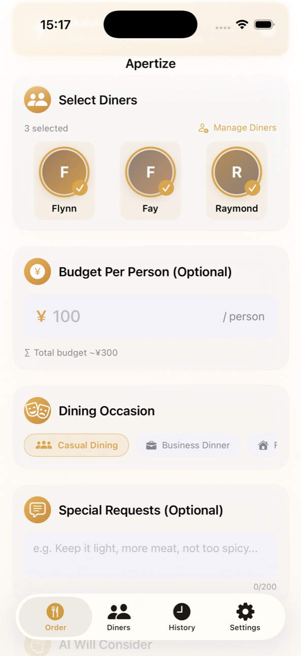 Set a per-person budget and a dining occasion. Apertize optimizes the whole order around it.